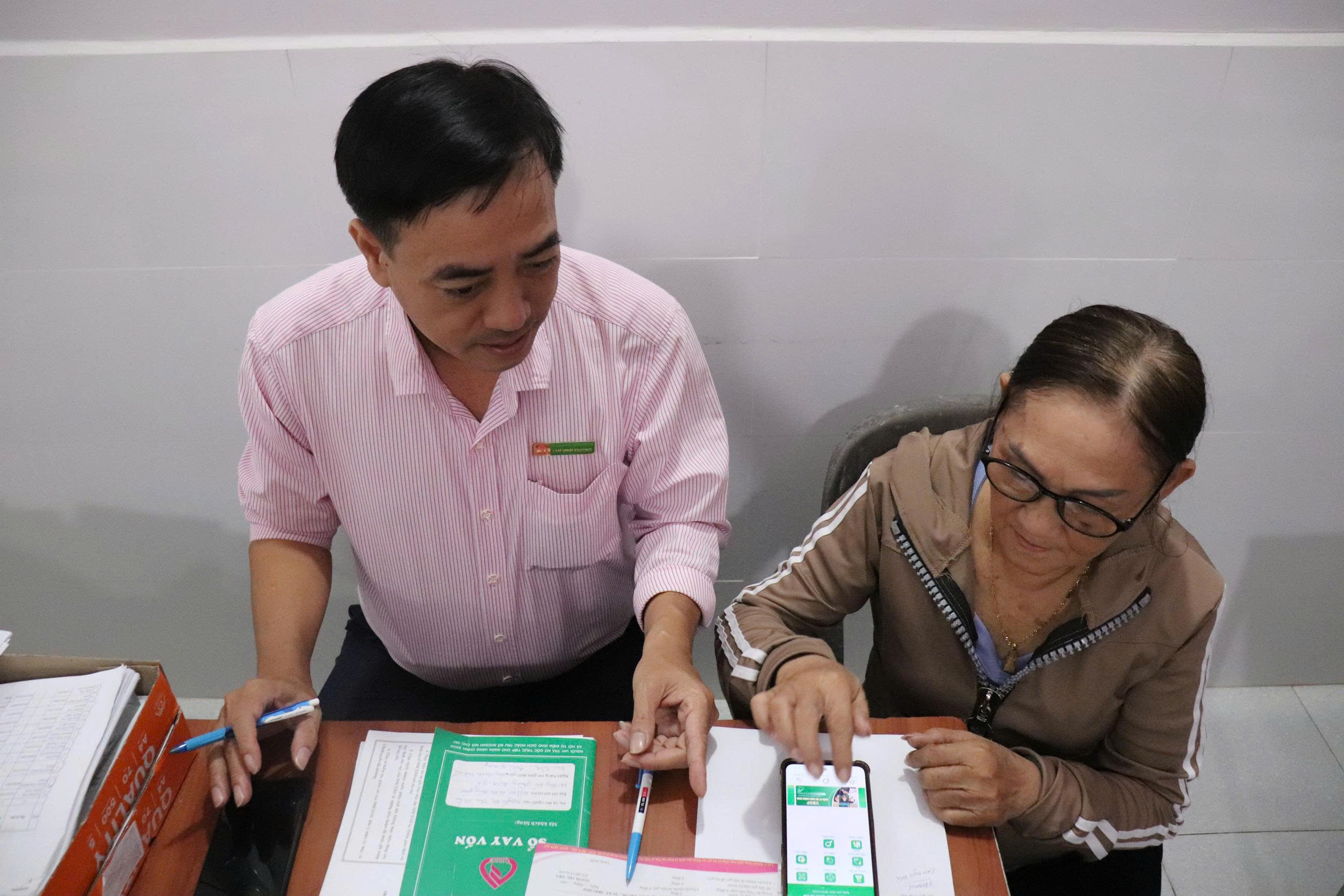 Ảnh: Cán bộ tín dụng hướng dẫn hộ vay sử dụng ứng dụng VBSP SmartBanking)