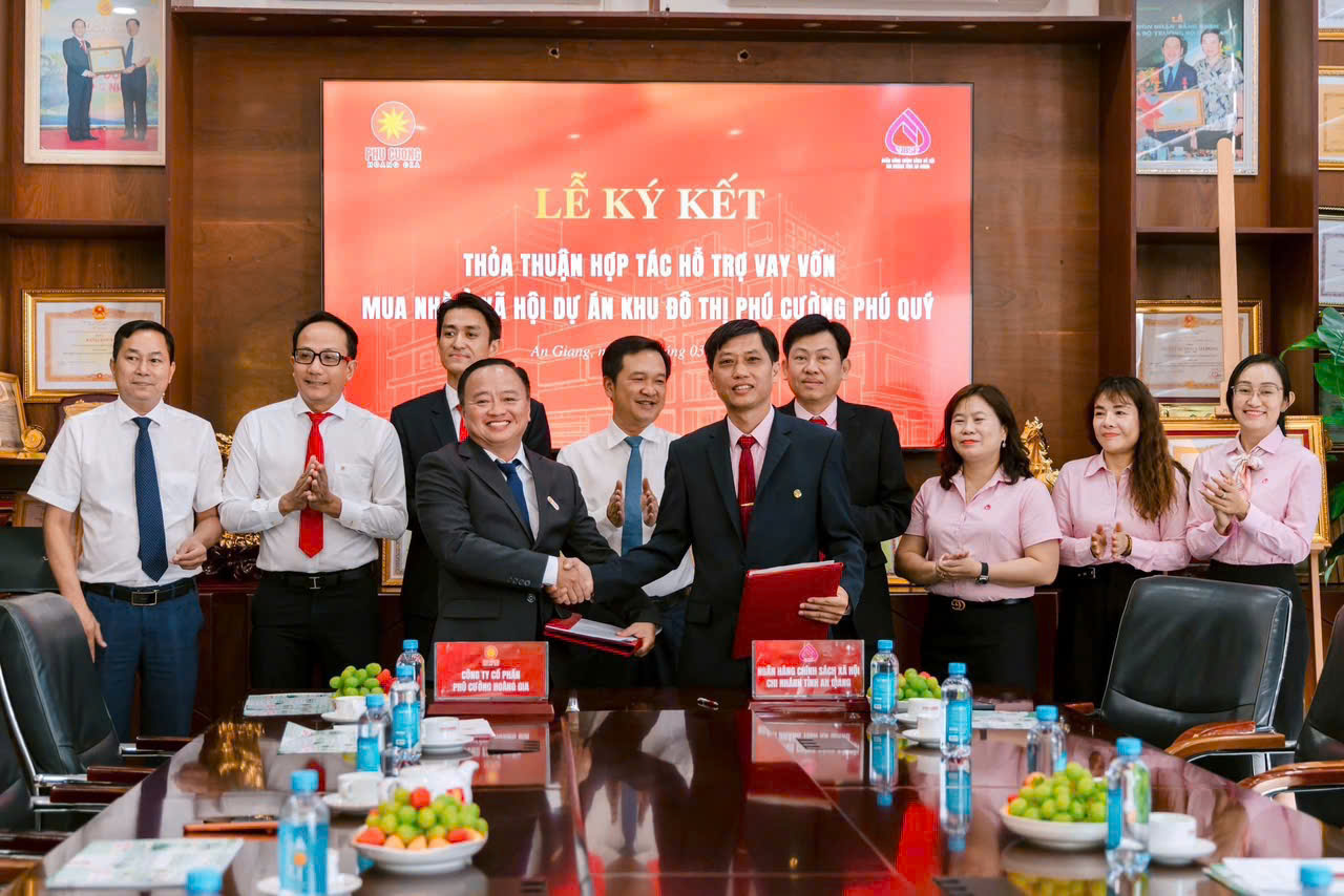 Chiều ngày 31/3/2026, tại phường Rạch Giá, tỉnh An Giang, Công ty Cổ phần Phú Cường Hoàng Gia phối hợp với Chi nhánh Ngân hàng Chính sách xã hội (NHCSXH) tỉnh An Giang tổ chức Lễ ký kết thỏa thuận hợp tác hỗ trợ vay vốn mua nhà ở xã hội thuộc Dự án Khu đô thị Phú Cường Phú Quý.