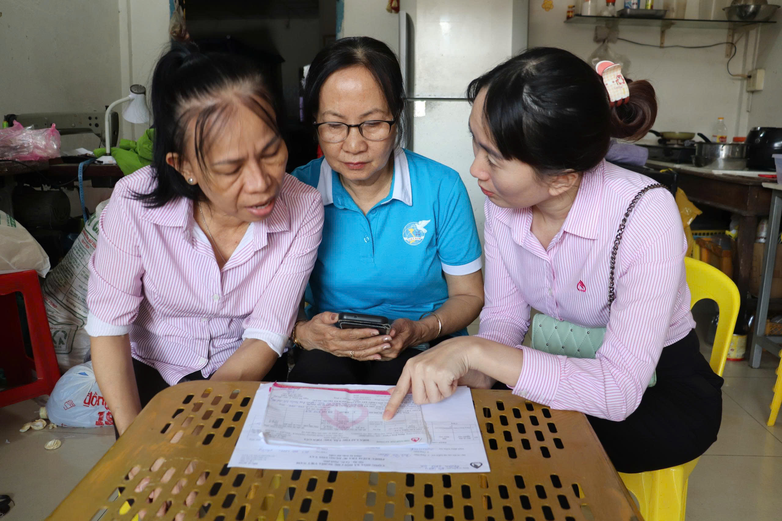 (Ảnh: Cán bộ tín dụng hướng dẫn chị Đặng Kim Châm theo dõi trên Biên lai về Dư nợ, thu lãi, tiết kiệm)