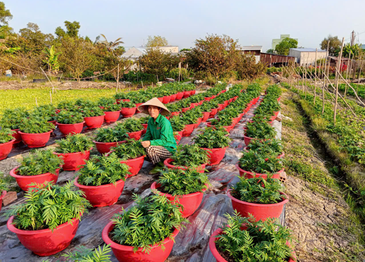 (ảnh chị Trần Thị Giào bên mô hình trồng hoa tết)