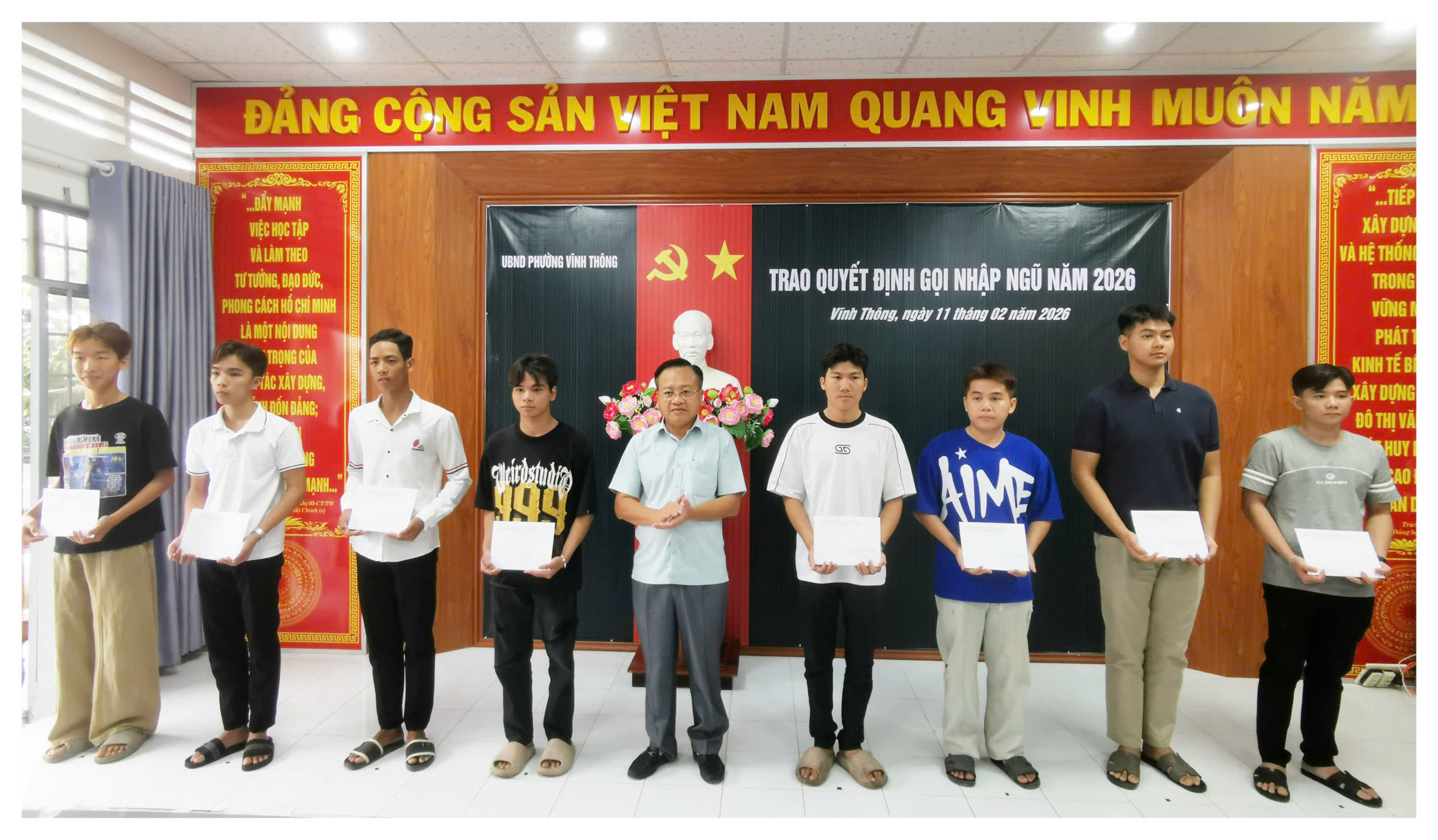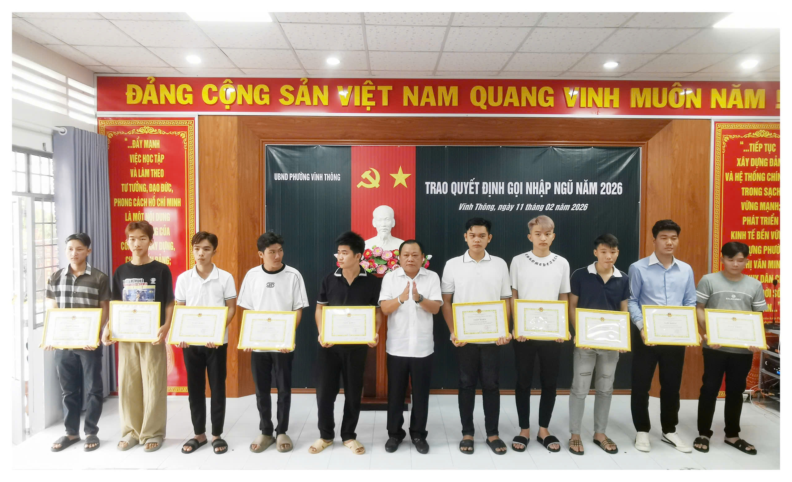 Ngày 11/2/2026 nhằm ngày 24 tháng Chạp năm Ất Tỵ, Hội đồng nghĩa vụ quân sự phường Vĩnh Thông đã tổ chức trao Quyết định gọi công dân nhập ngũ năm 2026. Đồng chí Bùi Phước Châu – Bí thư Đảng ủy và đồng chí Ngô Việt Trung, Phó Bí thư Đảng ủy, Chủ tịch Ủy ban nhân dân phường Vĩnh Thông đã đến dự và trao quyết định cho công dân đủ điều kiện nhập ngũ năm 2026.