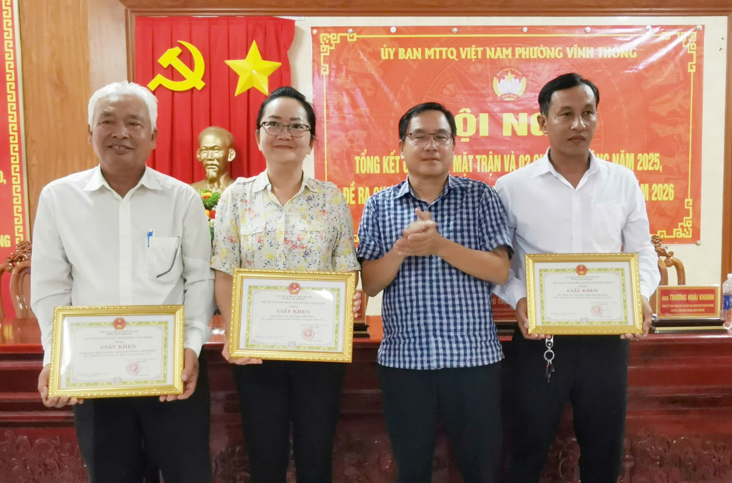 Đồng chí Tô Việt Huỳnh, Phó Bí thư Đảng ủy, Chủ tịch Hội đồng nhân dân phường Vĩnh Thông trao giấy khen của Chủ tịch Ủy ban nhân dân phường Vĩnh Thông tặng 3 tập thể: Ủy ban mặt trận tổ quốc Việt Nam phường Vĩnh Thông; Ban Công tác Mặt trận khu phố 2 và Ban Công tác Mặt trận khu phố Mỹ Hưng đạt thành tích hoàn thành tốt nhiệm vụ năm 2025;