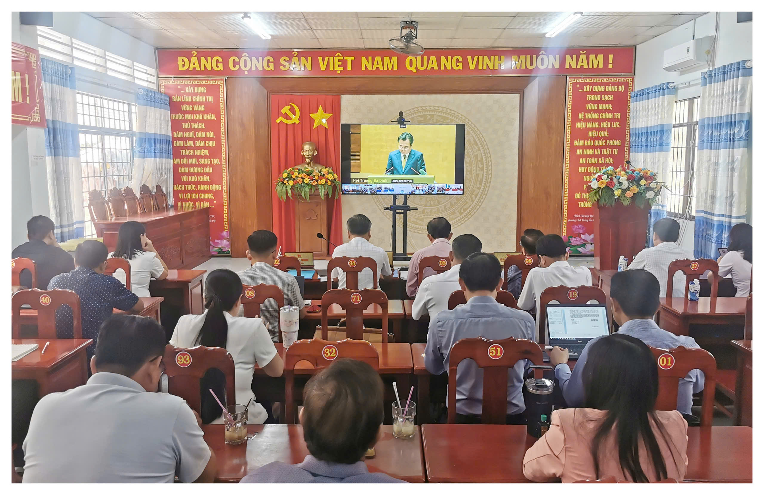 Tham dự hội nghị trực tuyến tại điểm cầu Đảng ủy phường Vĩnh Thông, tỉnh An Giang có đồng chí Thiếu Văn Nam, Phó Giám đốc Sở Giáo dục và đào tạo tỉnh An Giang – Thành viên Tổ công tác Tỉnh ủy. Các đồng chí Ủy viên Ban Thường vụ, Ủy viên Ban Chấp hành Đảng ủy, Hội đồng nhân dân, Ủy ban nhân dân, Ủy ban Mặt trận Tổ quốc Việt Nam phường Vĩnh Thông, các đồng chí Bí thư chi, đảng bộ trực thuộc, hiệu trưởng, hiệu phó các trường mẫu giáo mầm non, tiểu học, trung học cơ sở và trung học phổ thông. Cán bộ, công chức, viên chức các cơ quan Đảng, Chính quyền phường Vĩnh Thông.